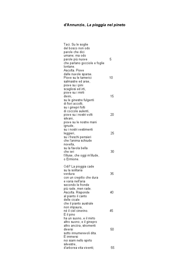 La pioggia nel pineto di Gabriele D’Annunzio. Redazione Studentville Pubblicato il 6 lug 2018. LA PIOGGIA NEL PINETO DI GABRIELE D’ANNUNZIO. La Pioggia nel Pineto: testo della Poesia. Taci. Su le soglie. del bosco non odo. parole che dici. umane; ma odo. parole più nuove. che parlano gocciole e foglie. lontane. Ascolta. Piove. dalle nuvole sparse.. Gabriele D’Annunzio, La pioggia nel pineto, 1903. È un’opera costituita da quattro strofe, ciascuna di 32 versi liberi e contraddistinta dalla rima * sciolta, ma si individua quella interna (“umane”, “lontane” nei versi 4 e 7, “dita”, “vita” nei versi 51 e 55, “pianto”, “canto” nei versi 69 e 71, “nere.
